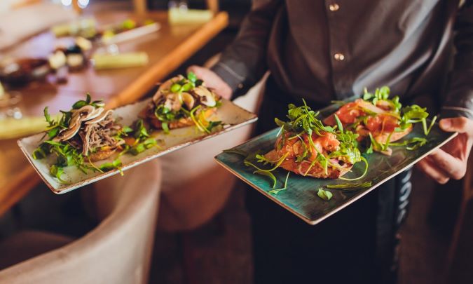 Suggestively sells and serves food and drink needs and specials